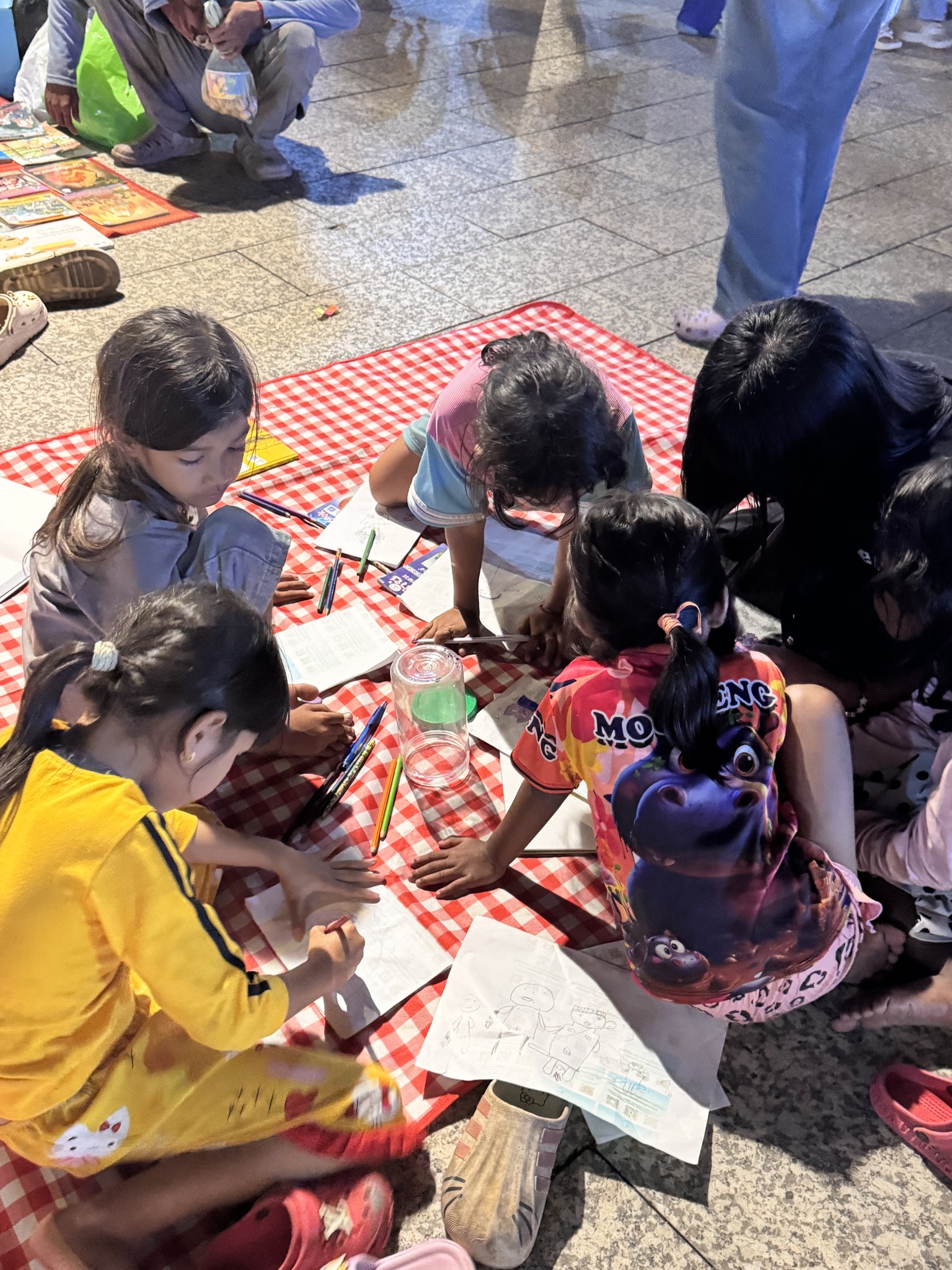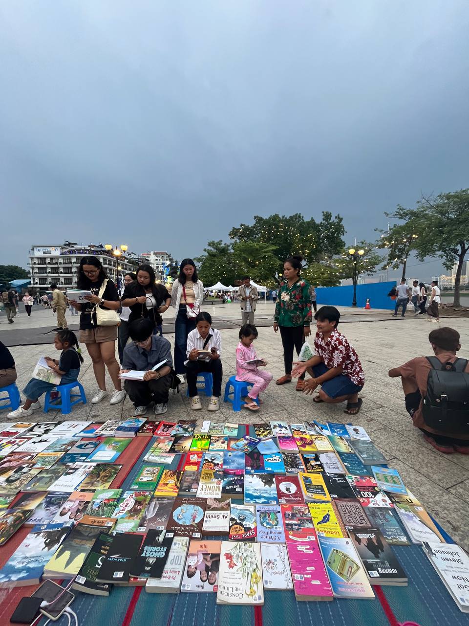 Unlike typical libraries, the OBOC Reading Street doesn’t operate from a van or building. Instead, it offers books in the open air, under the city lights, along the riverside at one of Phnom Penh’s most iconic gathering spots. From 5:00 p.m. to 9:00 p.m. every Saturday and Sunday, passersby are drawn in by the inviting sight of colorful children’s books, local literature, and educational materials spread out on mats. Anyone is welcome to sit, browse, and read — for free.